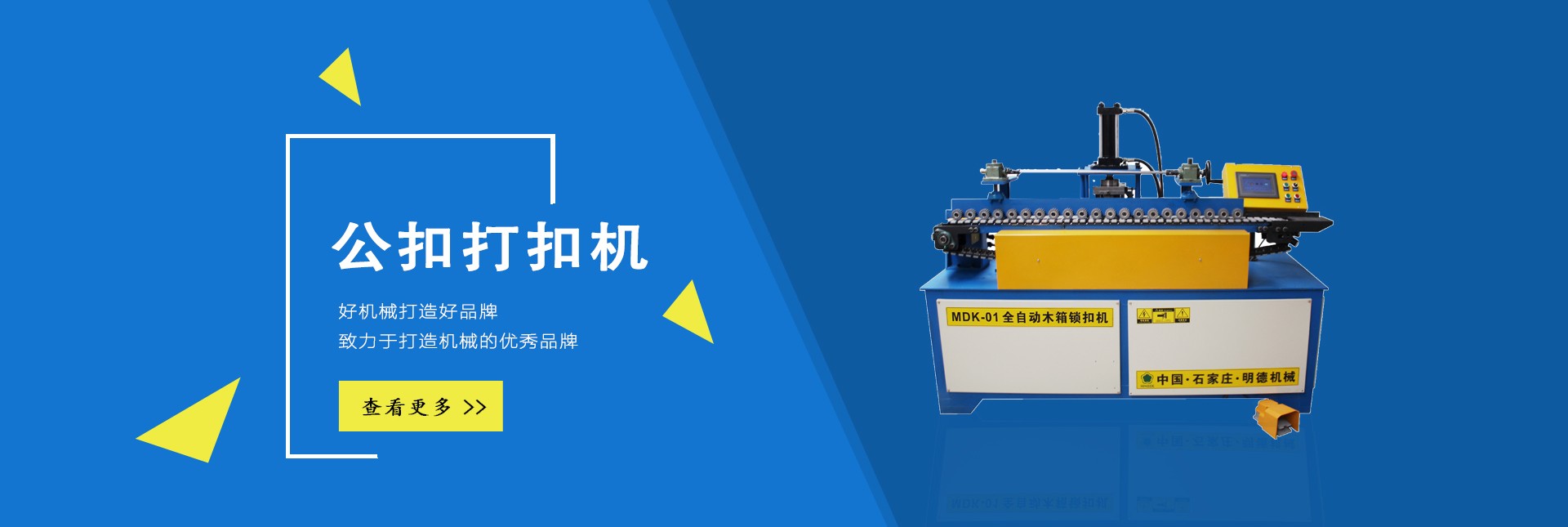 石家莊明德包裝機(jī)械有限公司是國(guó)內(nèi)專業(yè)生產(chǎn)木全自動(dòng)木箱鋼帶機(jī)、半自動(dòng)公母扣木箱打扣機(jī)、全自動(dòng)雙排孔定長(zhǎng)切斷機(jī)、美式托盤打釘機(jī)械、托盤刨槽機(jī)、倒角機(jī)、木包裝箱、木托盤的生產(chǎn)廠家。